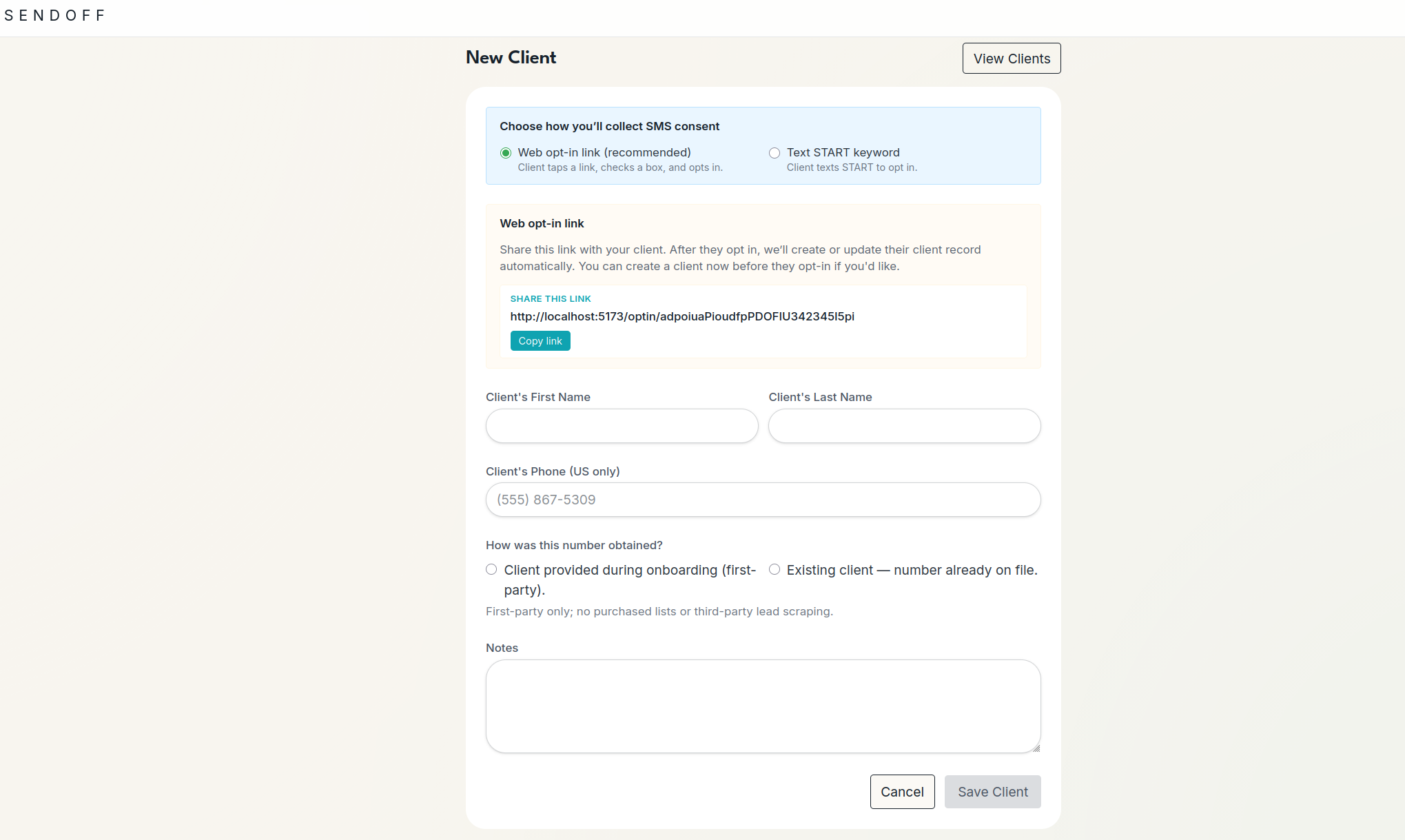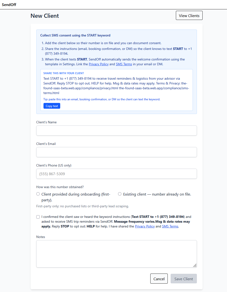 On submission, SendOff records consent (timestamp + IP), marks the client as opted in,