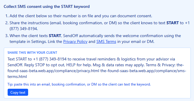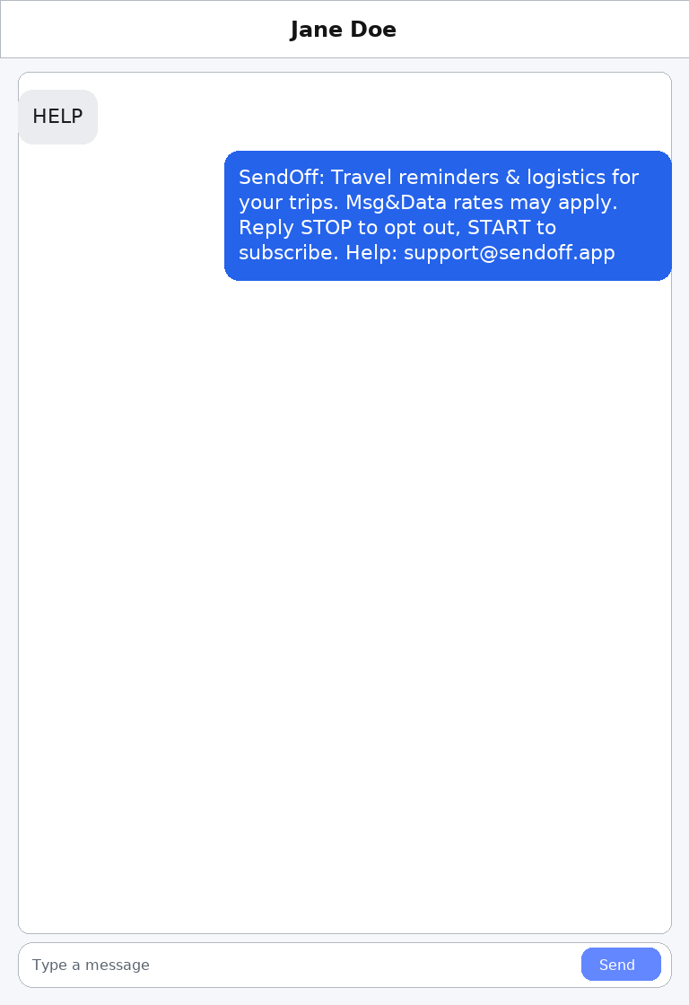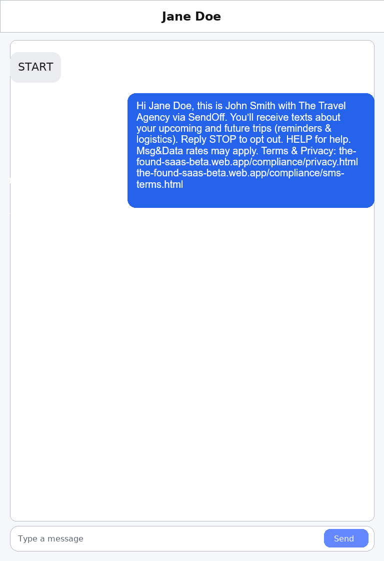 “Hi Jane Doe, this is John Smith with The Travel Agency via SendOff. You’ll receive texts