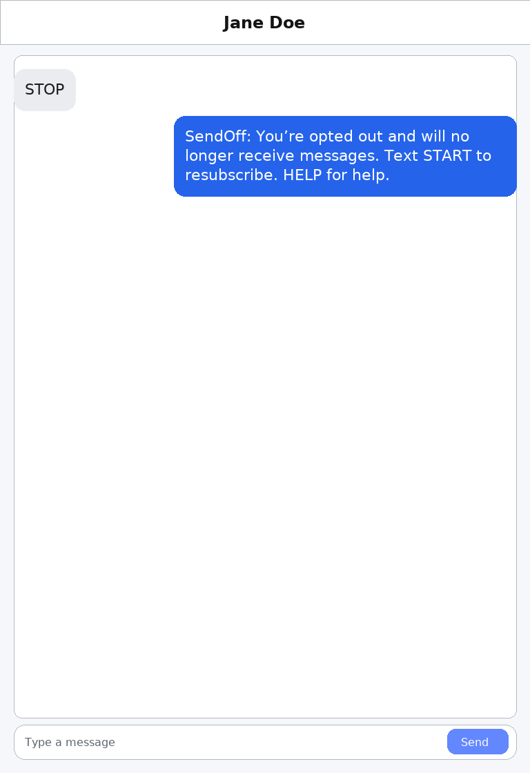message (customizable in Settings) and logs the delivery. STOP/HELP logic is automated.
